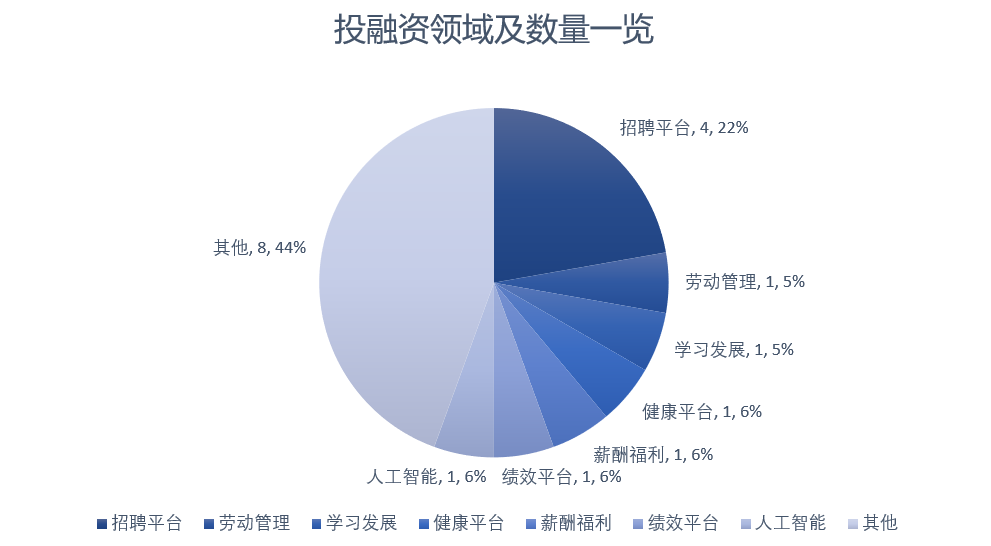 在本月HRTech投融资报道细分领域方面,主要涉及:招聘平台(4起)、劳动管理(1起)、学习发展(1起)、健康平台(1起)、薪酬福利(1起)、绩效平台(1起)、其他(8起)。投资领域重心板块以招聘平台为主。