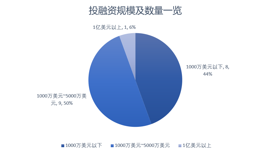 在融资规模上:本月报道的投融资项目均披露了融资金额,融资金额从170万英镑到1.2亿美元不等,极差较大。投融资报道的规模区间主要集中在1000万美元~5000万美元(9)起,1000万美元以下报道了(8)起,1亿美元以上报道了(1)起。