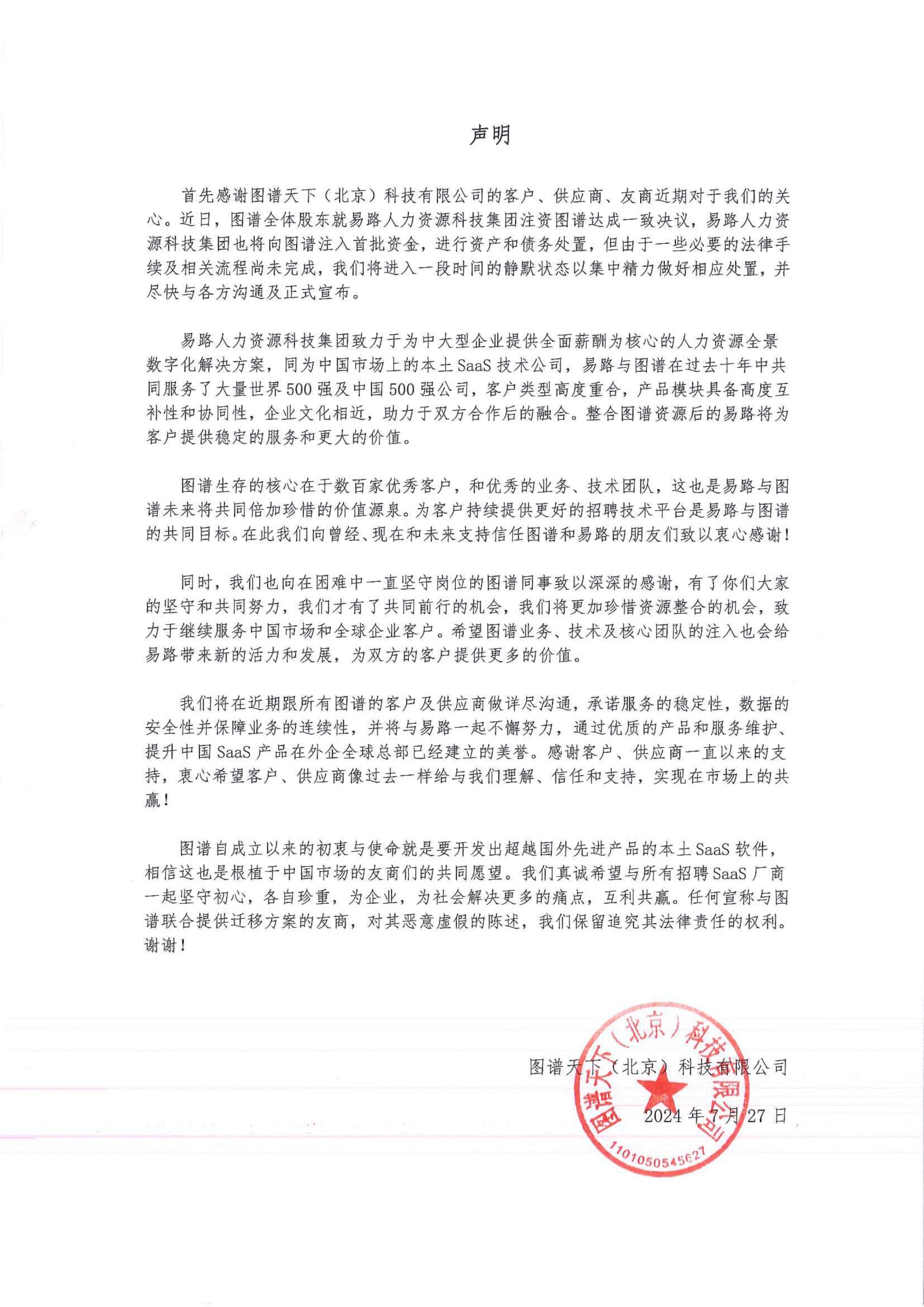首先感谢图谱天下(北京)科技有限公司的客户、供应商、友商近期对于我们的关心。近日,图谱全体股东就易路人力资源科技集团注资图谱达成一致决议,易路人力资源科技集团也将向图谱注入首批资金,进行资产和债务处置,但由于一些必要的法律手续及相关流程尚未完成,我们将进入一段时间的静默状态以集中精力做好相应处置,并尽快与各方沟通及正式宣布。