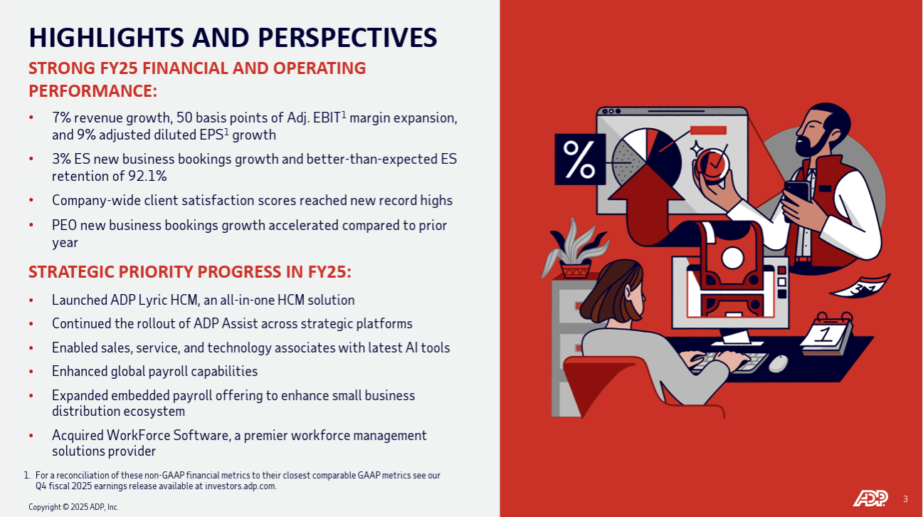 2025年7月30日美东时间,美国新泽西州罗瑟兰 — 全球领先的人力资源与薪酬解决方案提供商 ADP(纳斯达克股票代码:ADP)今日宣布其截至2025年6月30日的第四季度和2025财年全年财务业绩,并发布2026财年展望。