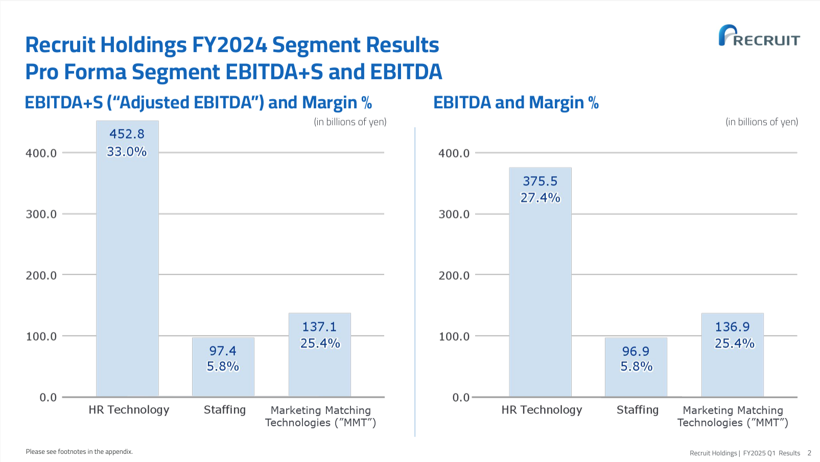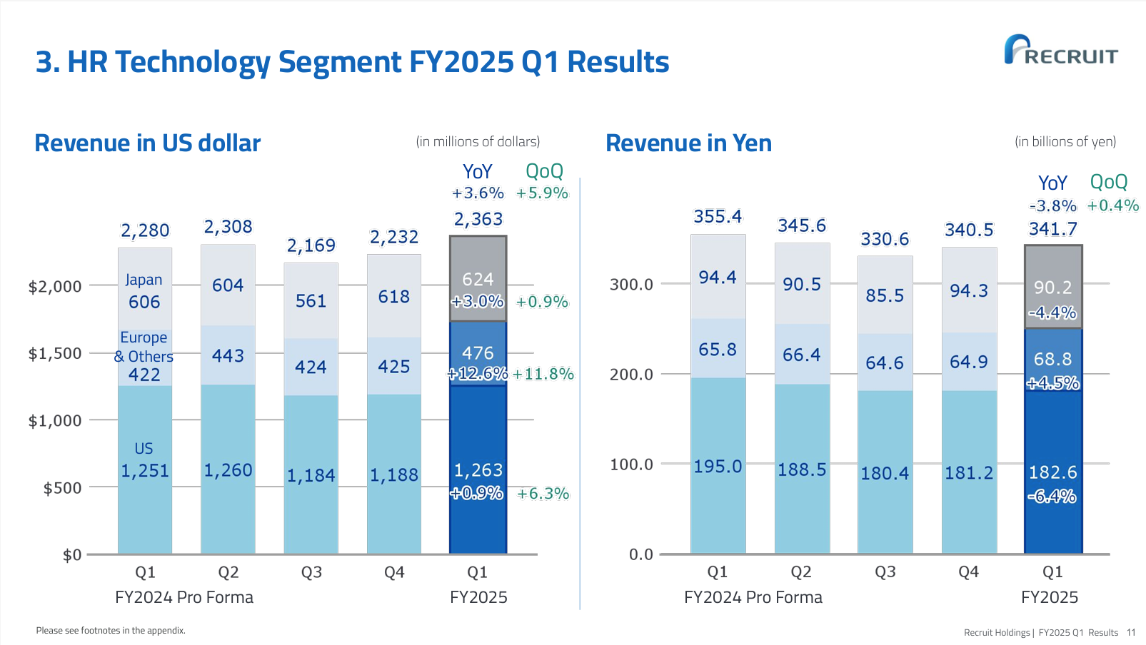 HR Tech板块整体营收为3,417亿日元,同比下滑3.8%。其中,美国市场营收下滑6.4%,日本市场下滑4.4%,但欧洲及其他地区实现了4.5%的增长。该板块EBITDA+S小幅增长1.4%,利润率从33.2%提升至35%,表明其AI驱动的人效提升初见成效。