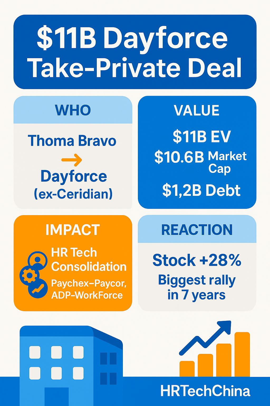 HRTech概述:私募股权巨头Thoma Bravo正与Dayforce洽谈一笔超过110亿美元的收购案,若成将使这家总部位于明尼阿波利斯的HR软件公司退市。消息公布后,Dayforce股价暴涨28%,市值约106亿美元。这起交易不仅是资本运作,更反映出全球HR科技行业正进入并购驱动的集中化阶段,未来三到五年或将出现更多类似案例,重塑人力资源管理市场格局。