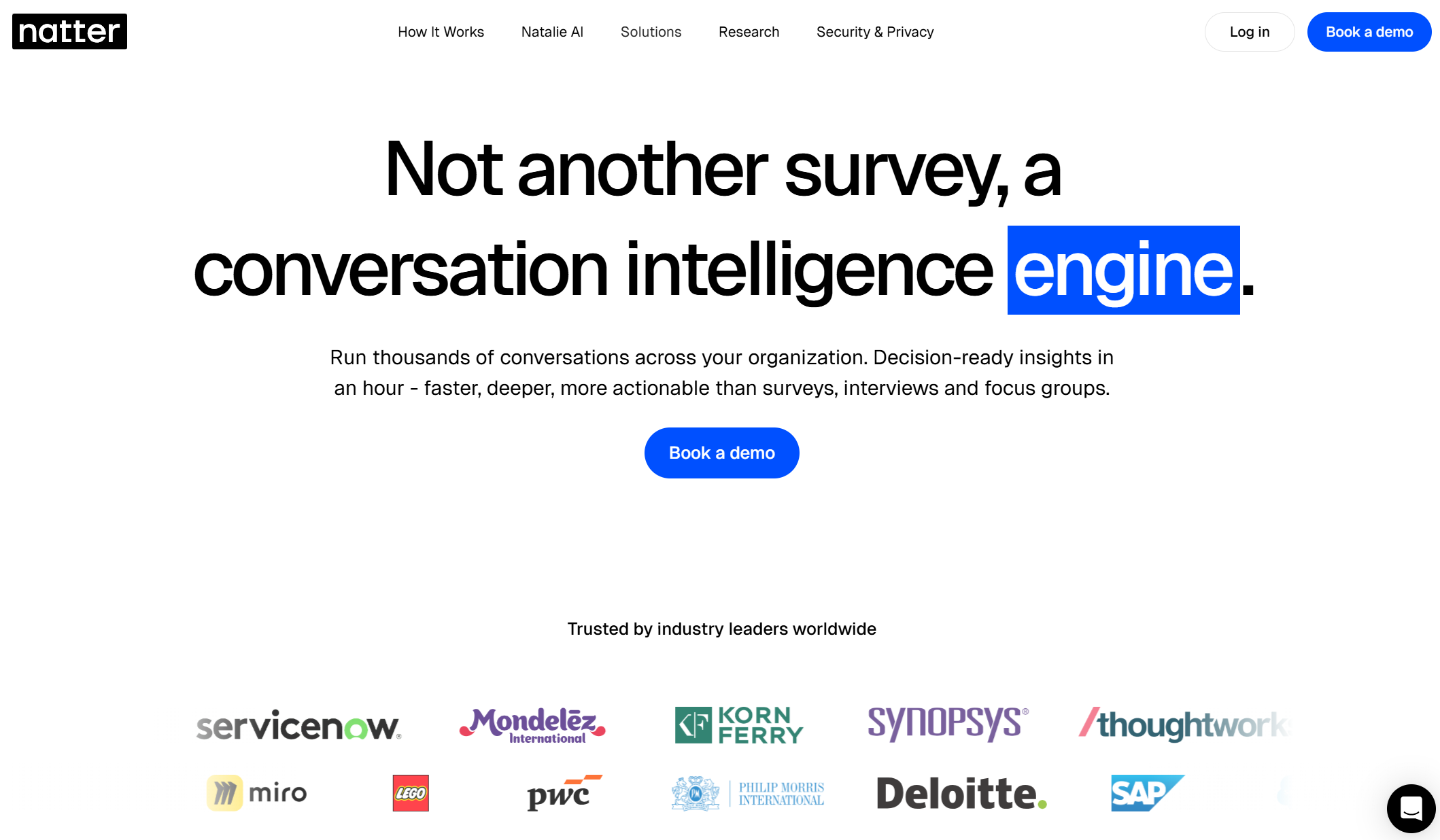相较于问卷调查、焦点小组、传统访谈等方式,Natter 以更强的深度、速度与真实性,为企业带来突破性洞察。目前,该平台已在埃森哲、ServiceNow、亿滋国际、普华永道、菲莫国际等全球大型组织中广泛应用,有效解决传统员工调研效率低、反馈失真、覆盖不足等核心痛点。