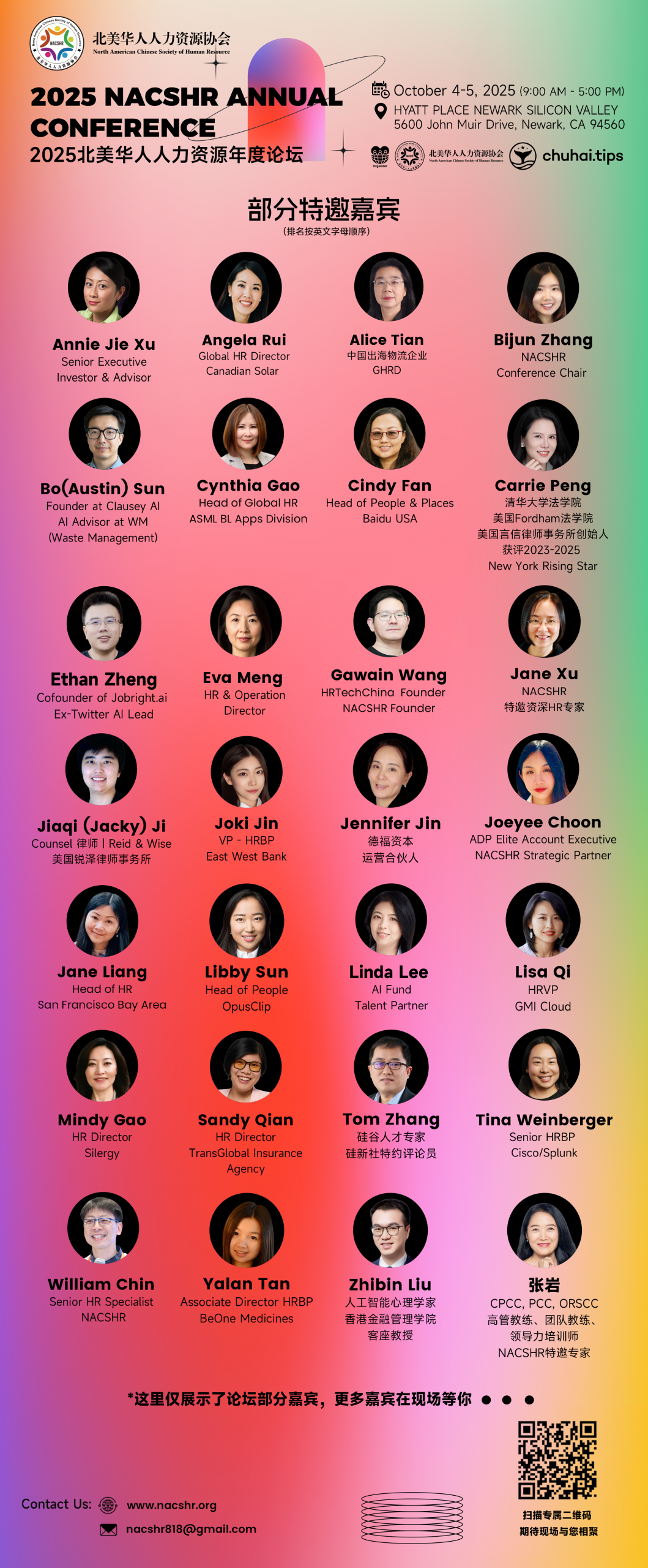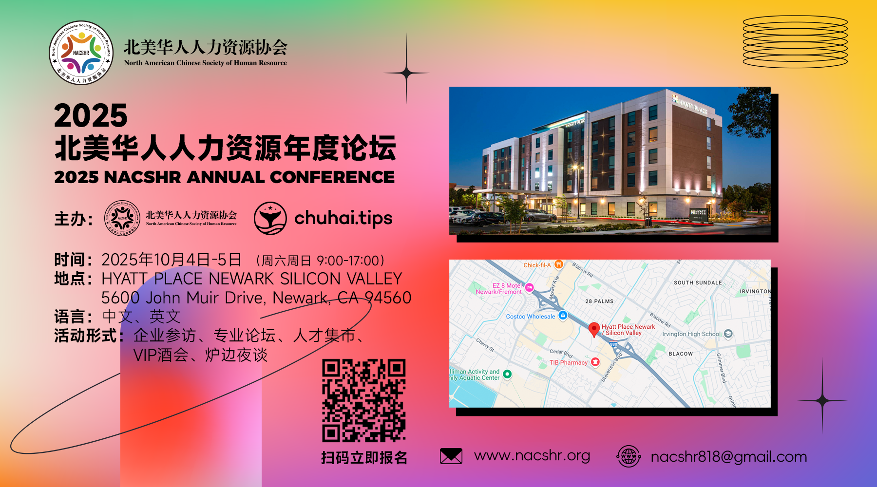 (硅谷,2025年9月)—由北美华人人力资源协会(NACSHR)主办的 2025北美华人人力资源年度论坛(NACSHR Annual Conference) 将于 10月4–5日 在硅谷盛大举行。作为一年一度的华人HR行业盛会,本次论坛将汇聚 30多位知名企业高管与HR专家,共同探讨 AI驱动的人力资源变革、跨境合规挑战、移民政策与人才战略、绩效与激励机制创新、初创企业HR建设、华人HR在北美的职场发展 等热点话题。