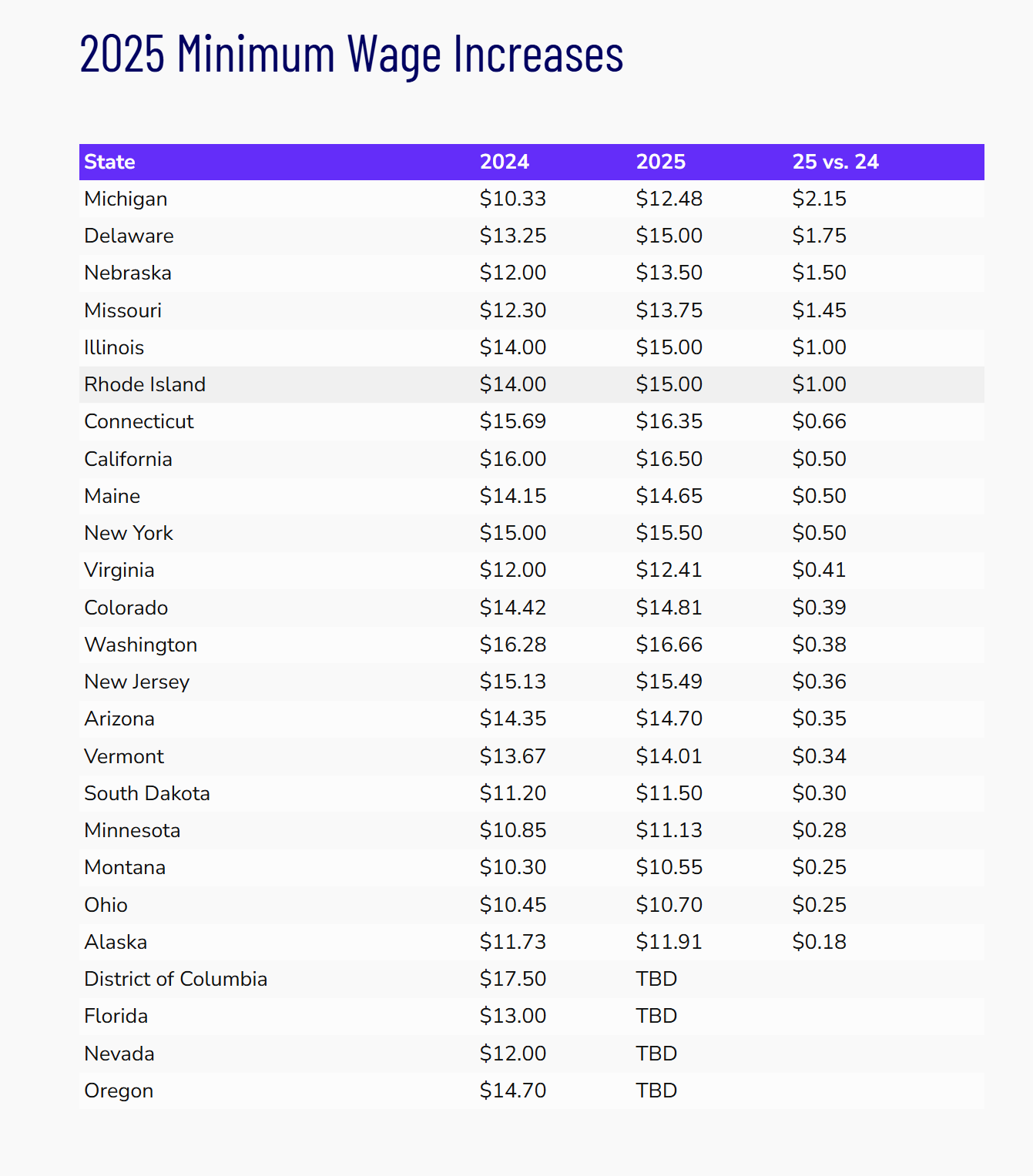 在美国2025年的劳动力市场版图中,最低工资的持续上调正成为影响企业用工预算和跨州雇佣策略的关键因素。根据人力资源与薪酬管理平台 PrimePay 发布的《2025 State Minimum Wage & Tax Facts》报告,截至2025年1月1日,全美共有25个州计划提高最低工资标准,其中包括加州、纽约、华盛顿、伊利诺伊和佛罗里达等主要经济州。