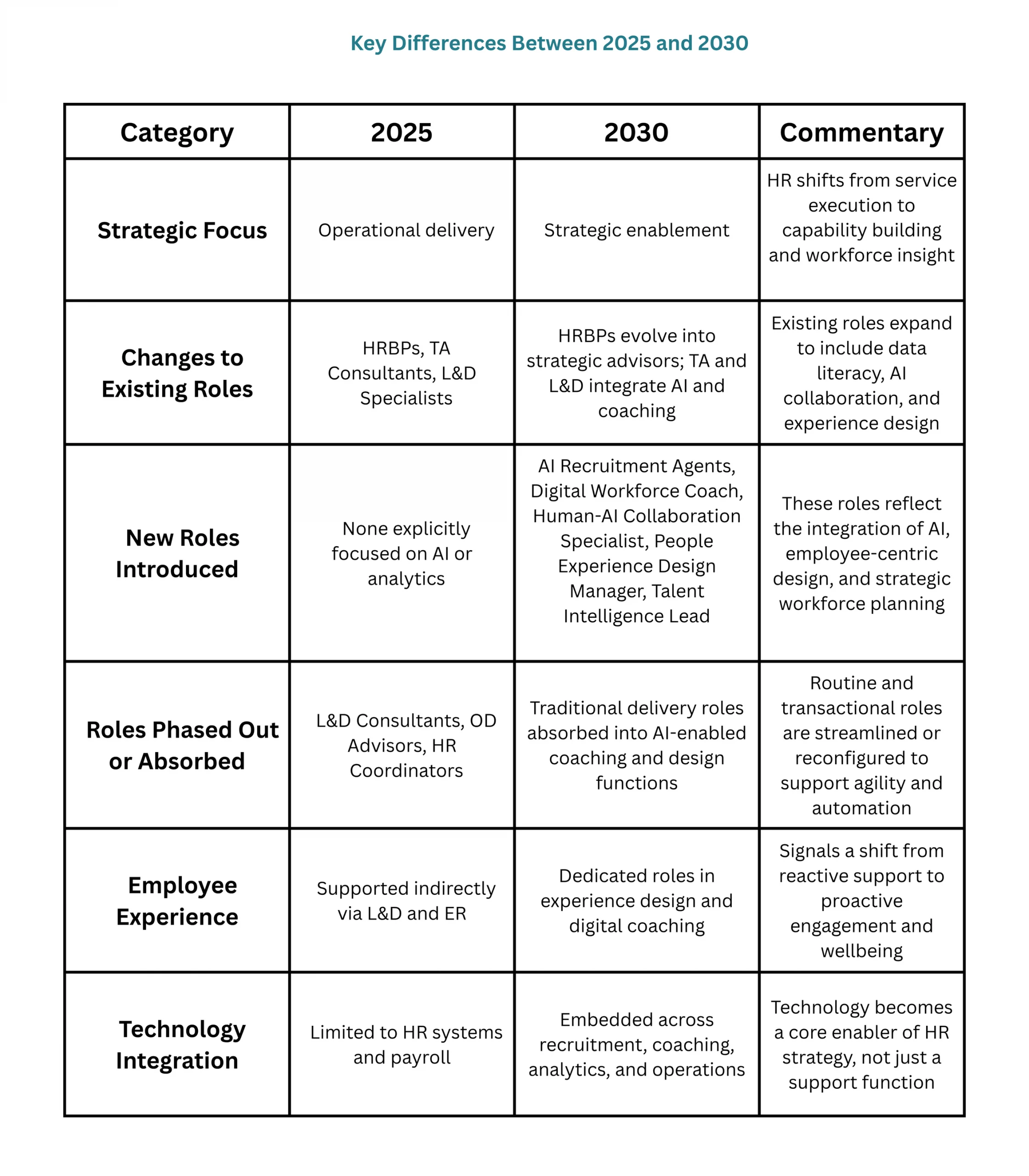 2025 年的图表反映了以运营交付为中心的传统人力资源模式。2030 年的图表在此基础上,引入了战略赋能角色和人工智能集成功能,以支持敏捷性、员工体验和数据驱动的决策。