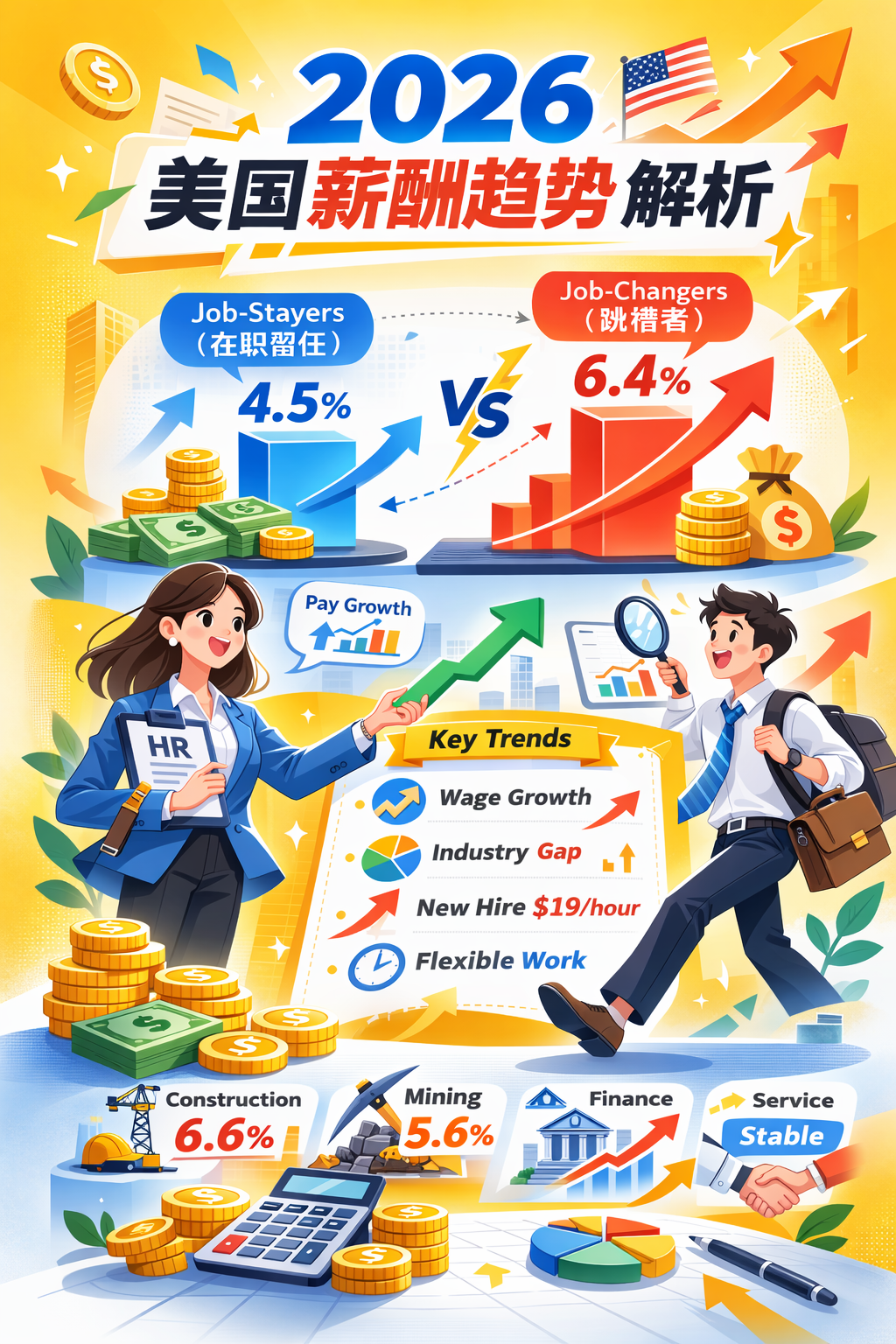 2026 年初,ADP Research 发布《Pay Trends to Watch in 2026》,基于超过 1,480 万美国私营部门员工的真实薪资数据,对当前劳动力市场的薪酬结构变化进行了系统分析。这份报告释放出一个清晰信号:美国劳动力市场已从疫情后的“高频跳槽、高溢价加薪”阶段,进入更为理性和分化的结构性调整周期。